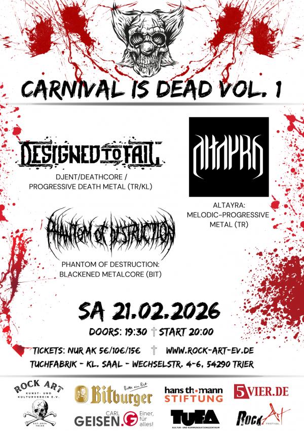 Keine Kamelle, kein Ufftata! Karneval ist tot! Und genau das feiern wir erstmalig eine Woche nach dem Fest der Narren im kleinen Saal der TUFA Trier. Kein Gedöns, nur Palaver und nur Abendkasse im Soli- Format. 3-4 Bands mit jeweils bis zu 60 Min Spielzeit, jeder wie er kann, oder will. Purer Musikgenuss wie früher im Schimmelkeller des Ex-Haus - nur ohne Schimmel! Und auch hier gilt: NO COVERBANDS!